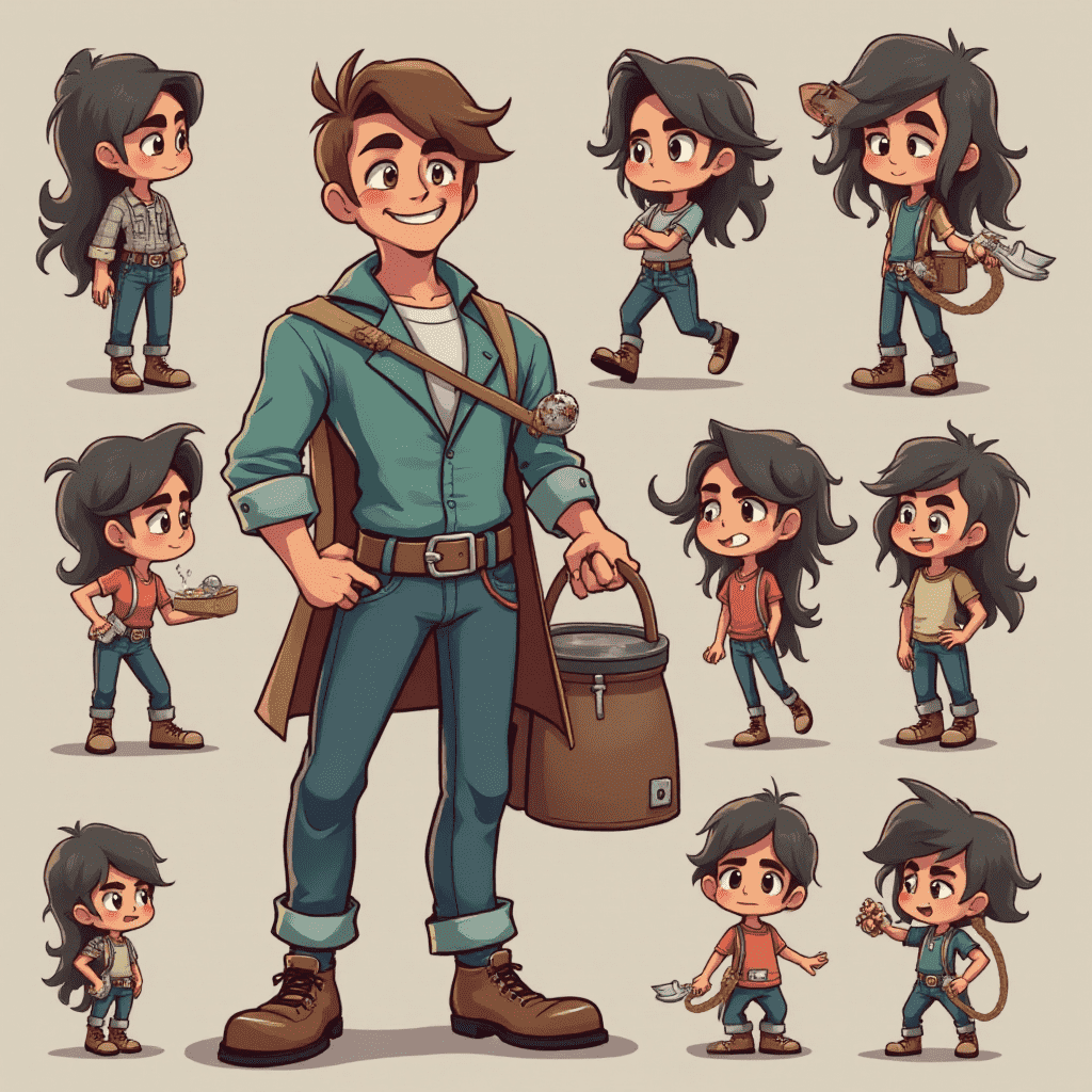A cartoon character, depicted in multiple poses and outfits, stands against a light beige background, smiling and holding a brown bag.