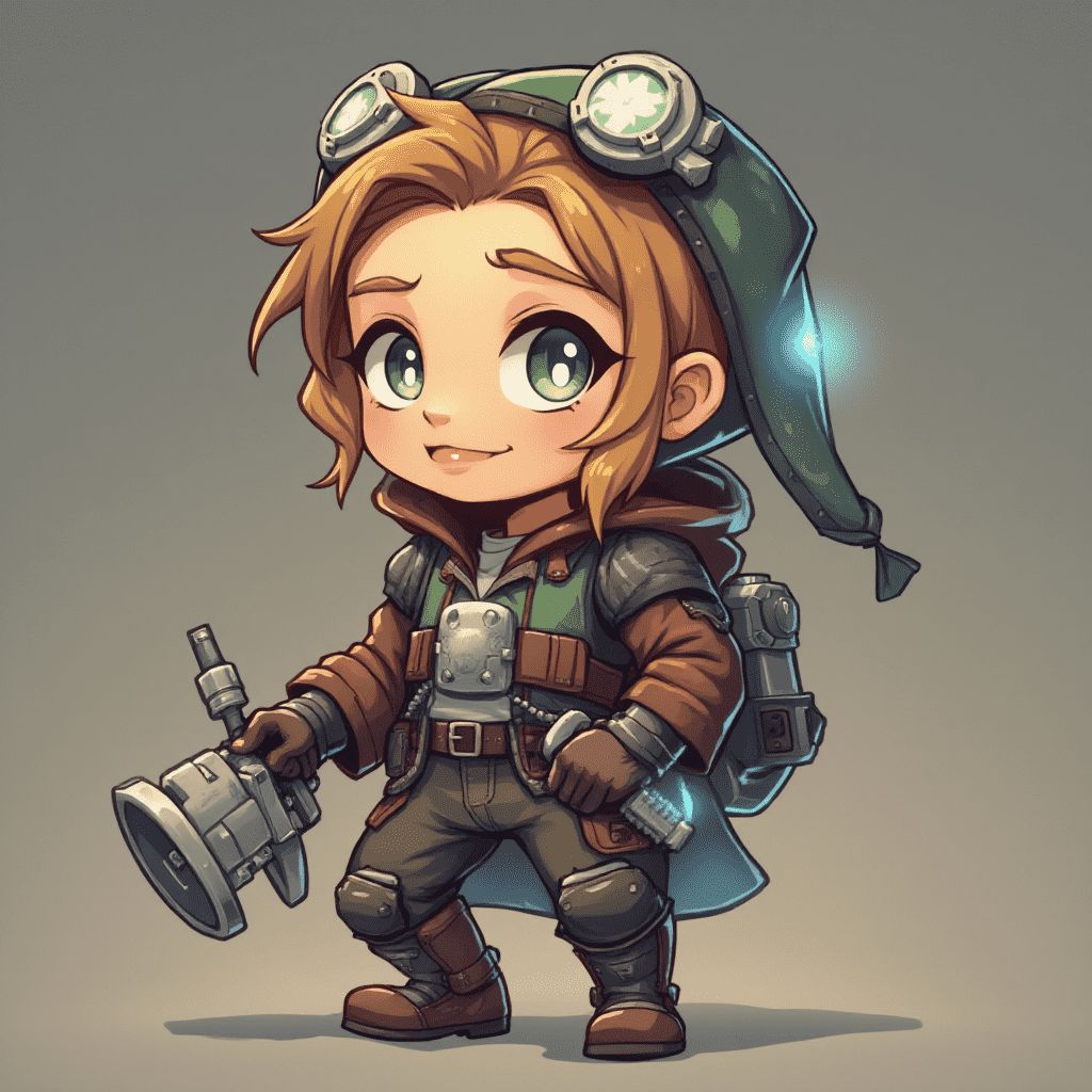 A chibi-style character with blonde hair, green eyes, and brown attire holds a silver device and wears a green hat with goggles.