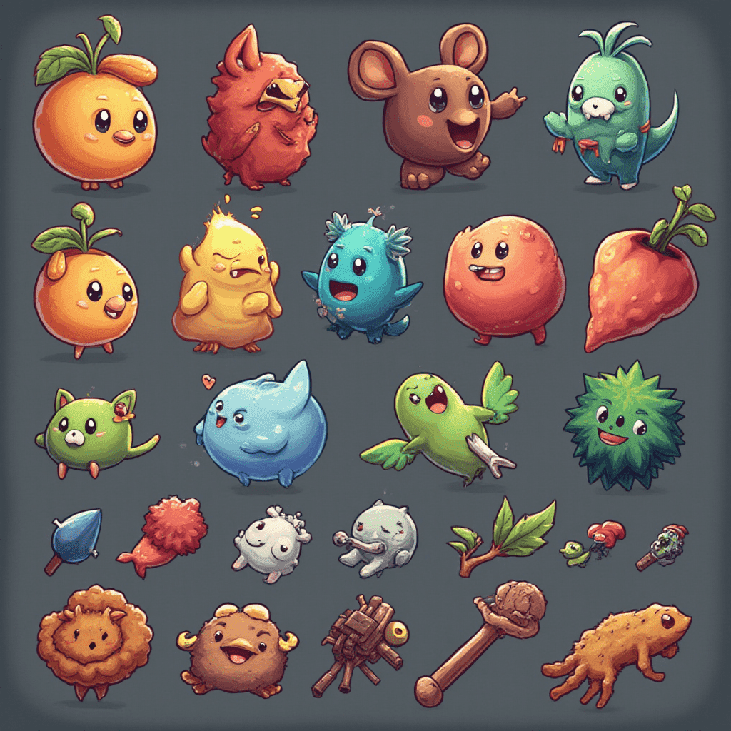 A grid of 25 whimsical, cartoon-style creatures features various colors, shapes, and expressions, arranged against a dark gray background.