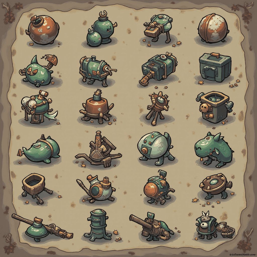 A grid of 25 whimsical, cartoon-style creatures in various poses and colors, set against a sandy background with scattered objects.