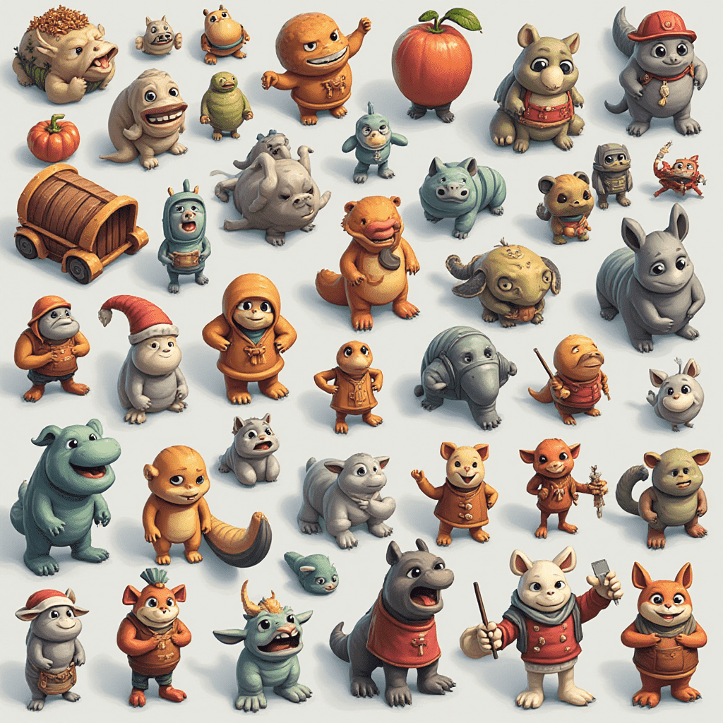A grid of 32 colorful, whimsical creatures with unique features and attire, arranged in a playful and dynamic composition.