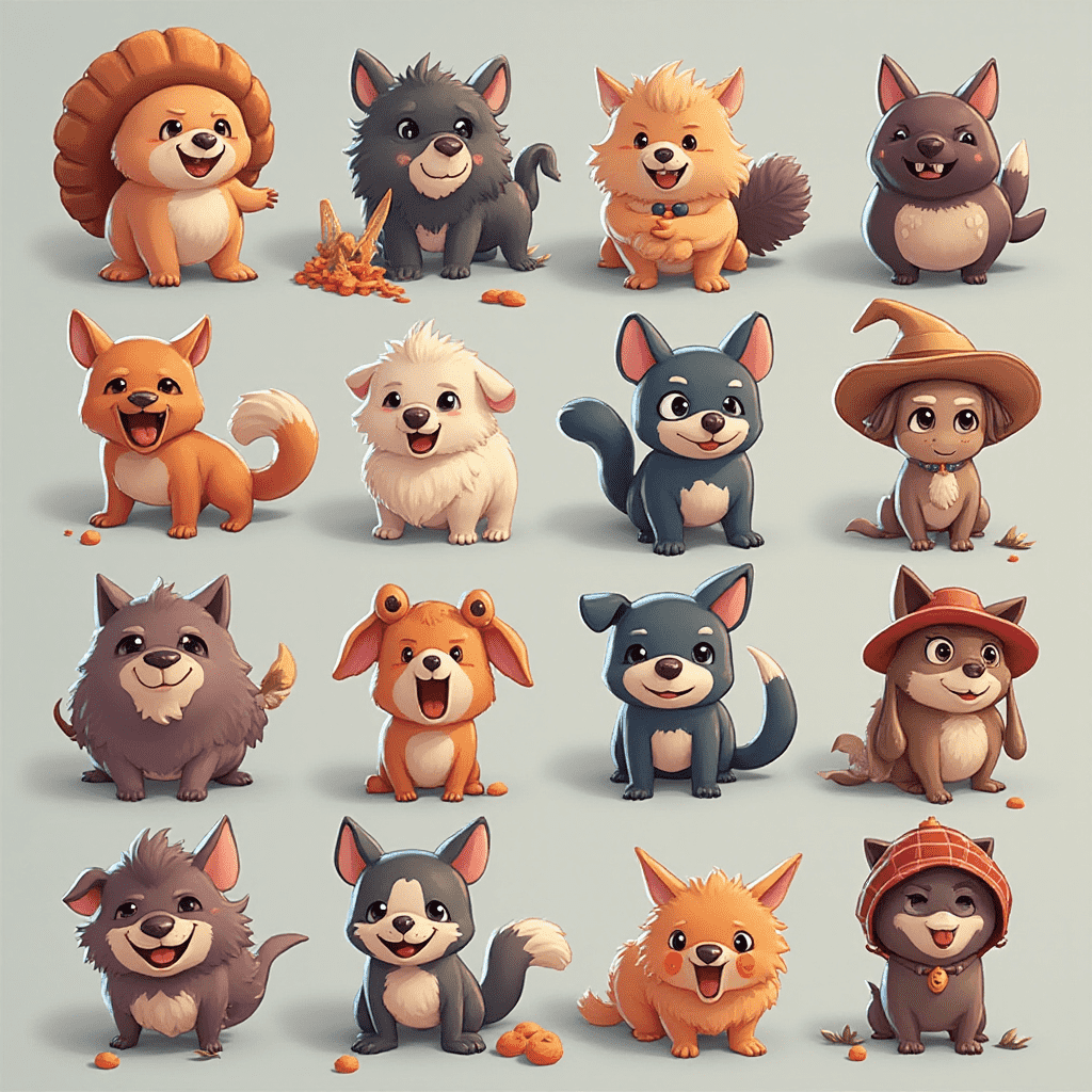 A grid of sixteen cartoon dogs in various colors and poses, displaying diverse expressions and actions.