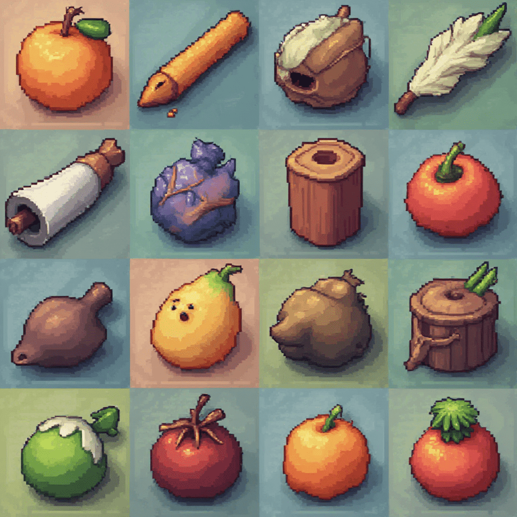 A grid of sixteen pixel art objects includes fruits, vegetables, tools, and containers.