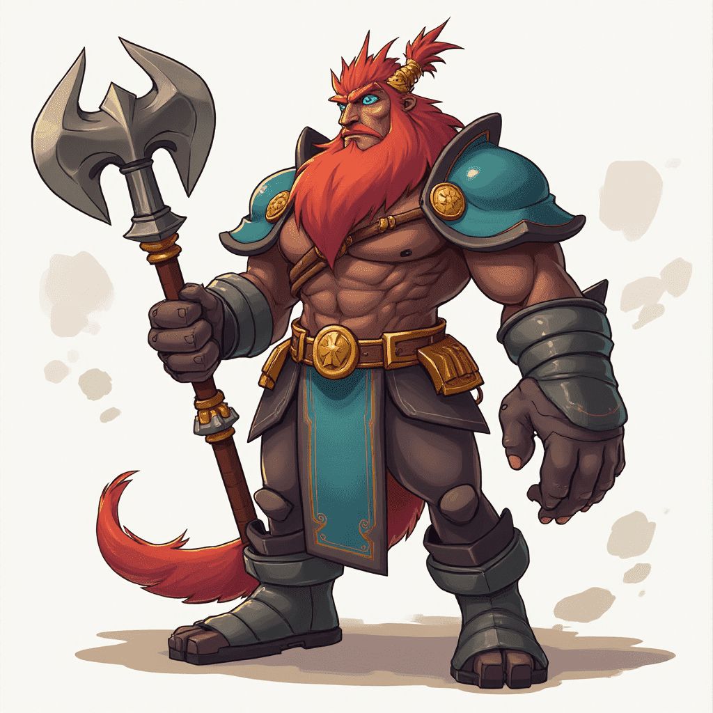 A muscular, bearded warrior in red and blue armor holds a large axe, standing confidently with determined eyes and a serious expression.