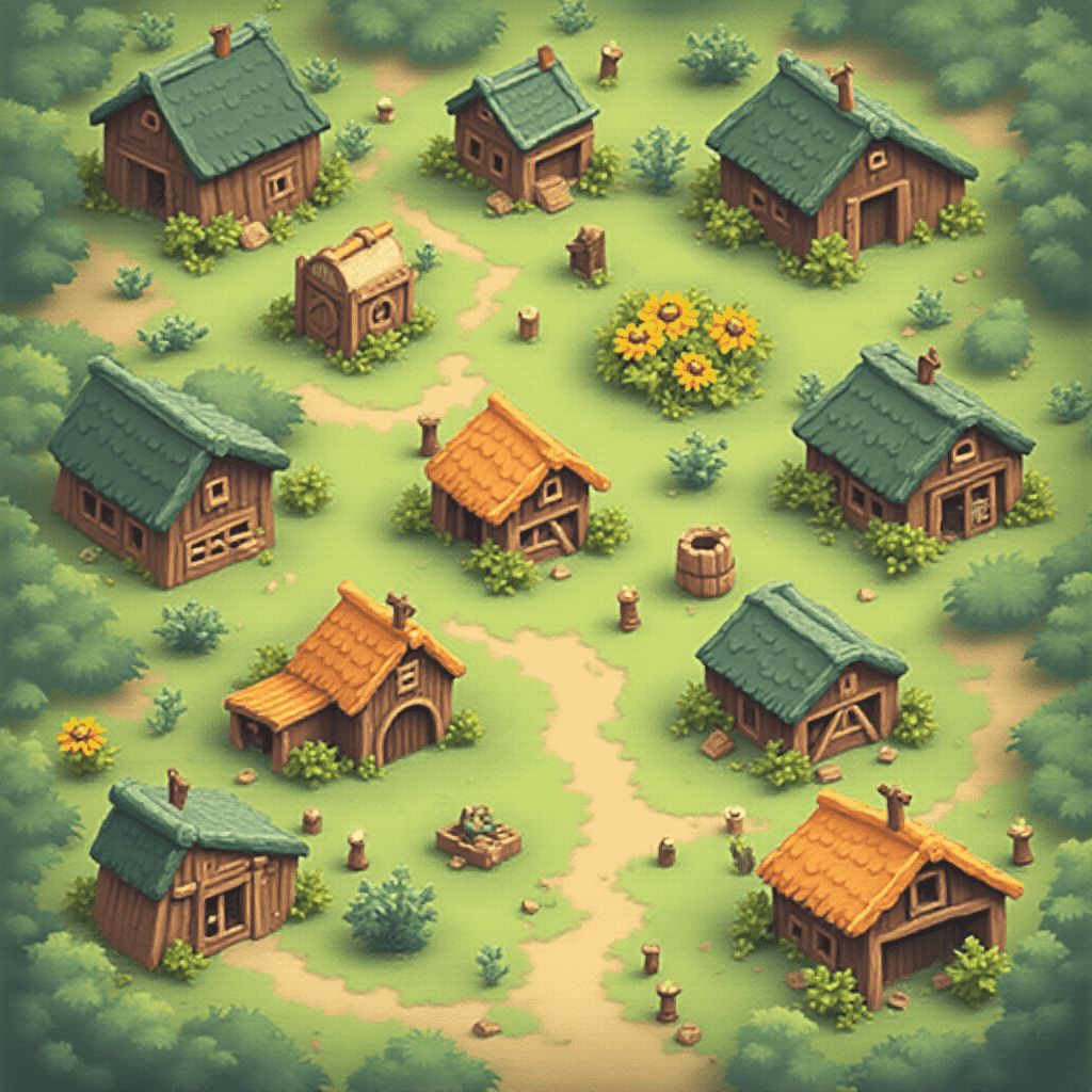 A quaint village features wooden houses with green roofs, surrounded by lush greenery and vibrant yellow flowers.