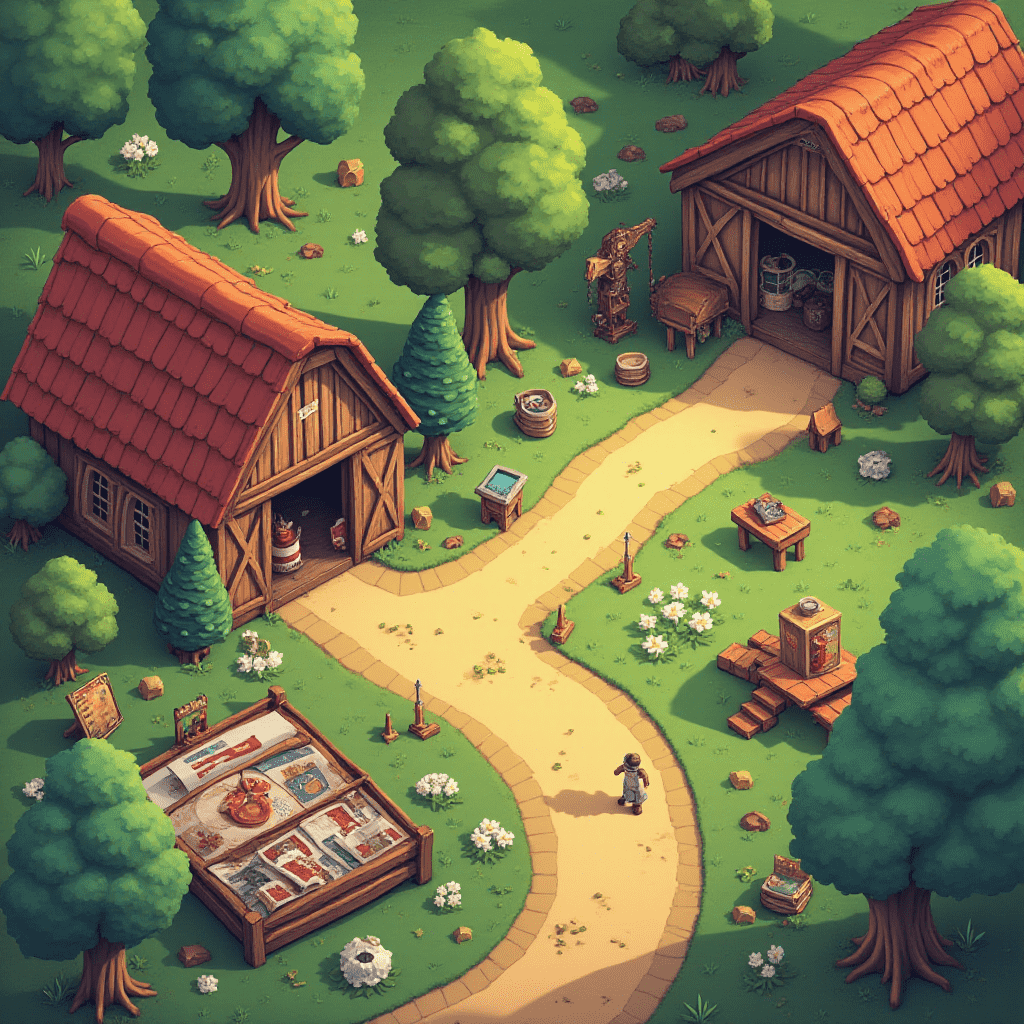 A quaint village scene features red-roofed wooden buildings, a winding dirt path, trees, bushes, flowers, and a person walking.