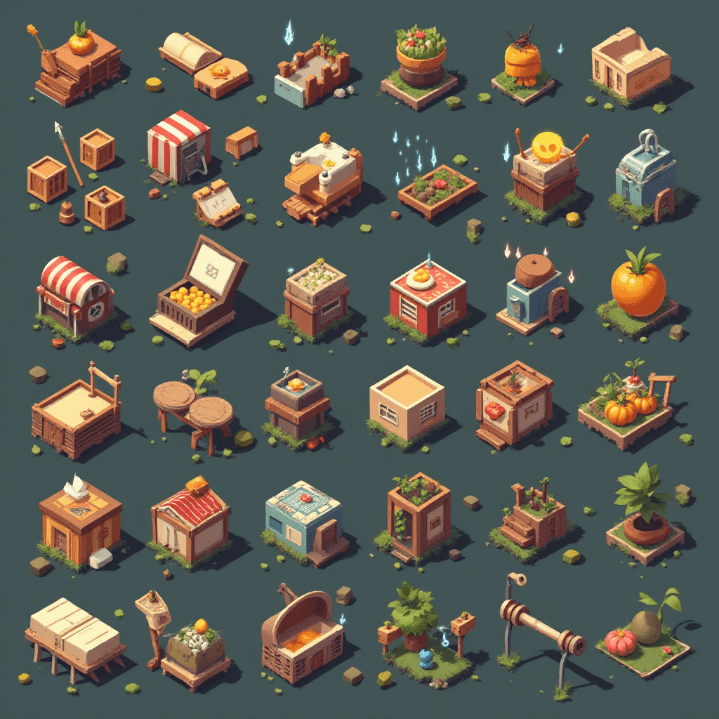 An isometric collection of miniature buildings, trees, flowers, and objects in various colors and styles.