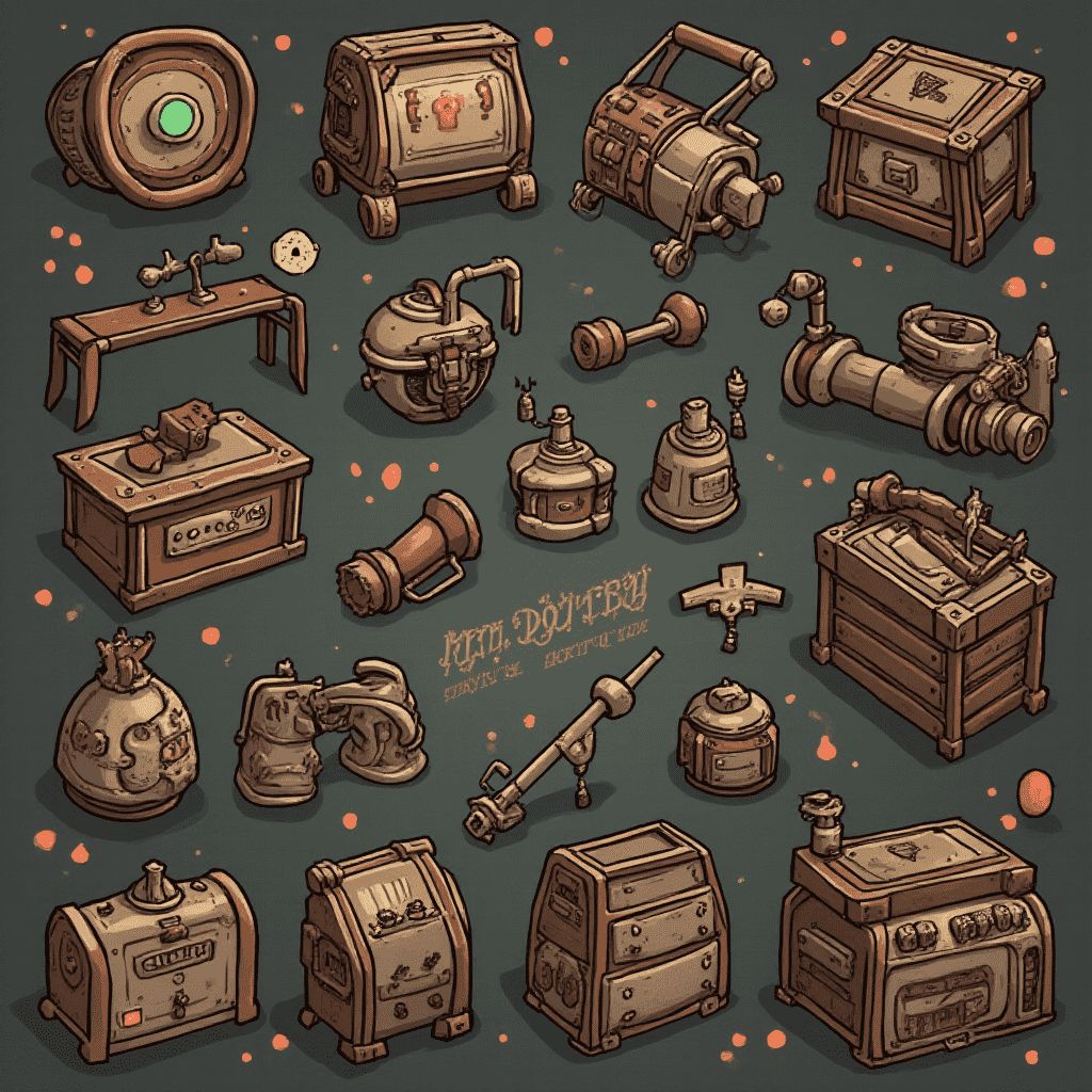 An assortment of antique and vintage objects, including barrels, boxes, clocks, and musical instruments, is arranged against a dark green backdrop.