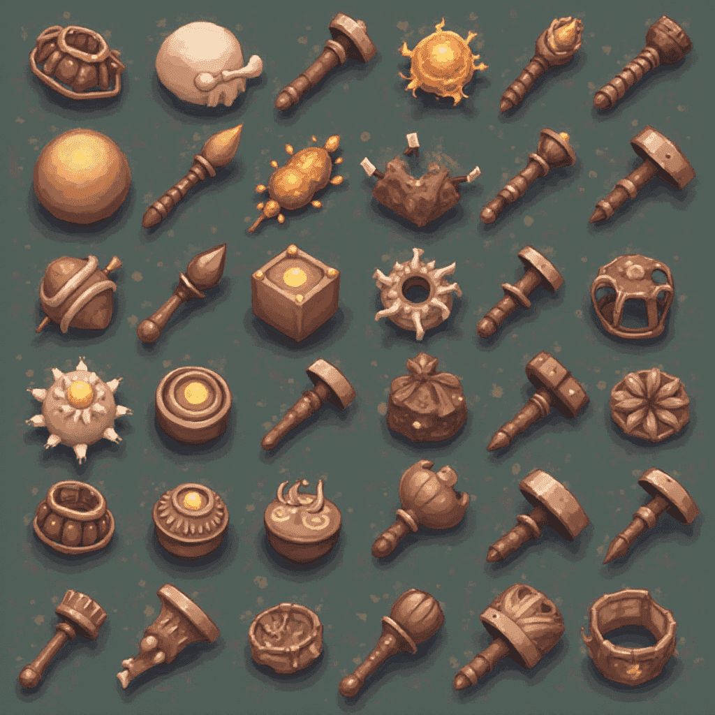 An assortment of antique-looking objects, primarily in brown hues, features unique shapes, patterns, and decorative elements.