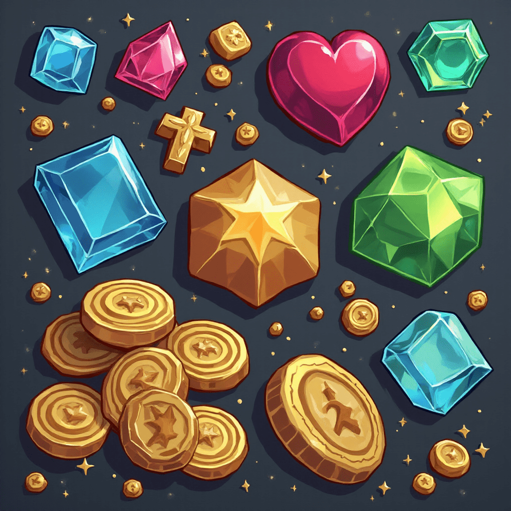 An assortment of gold and gem-like objects, including hearts, diamonds, cubes, and spheres, is scattered across a dark background with gold accents.