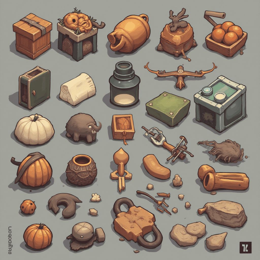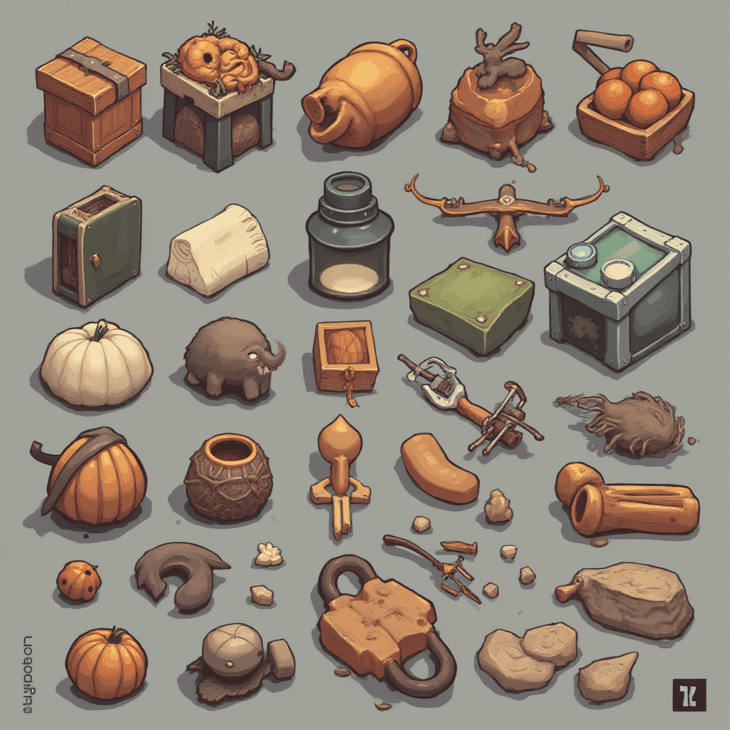 An assortment of isometric objects, including a wooden box, pitcher, basket, pumpkin, elephant, bird, tool, rock, and pot, are scattered across a gray backdrop.