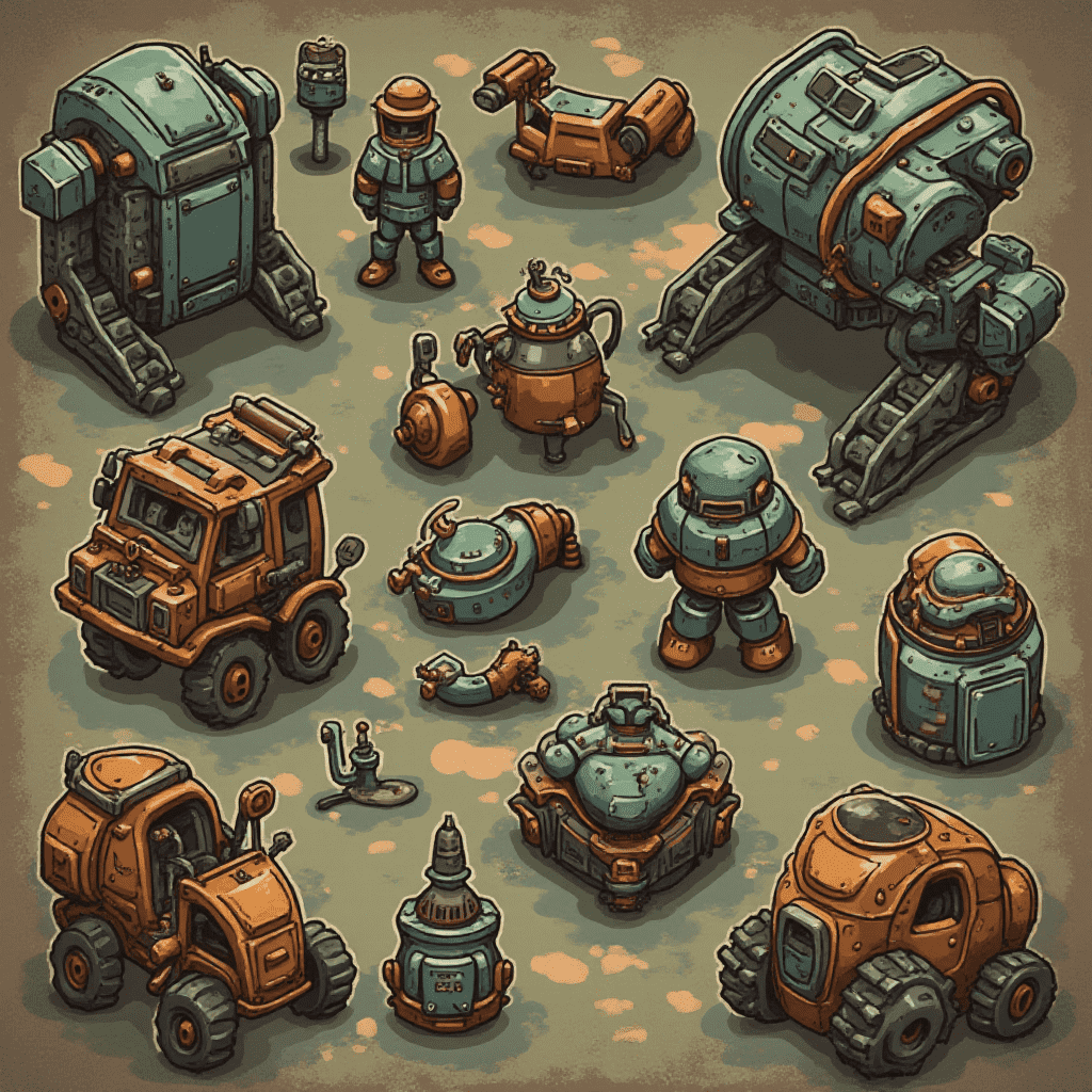 An assortment of unique, colorful vehicles and structures, including robots, spaceships, and vehicles, are arranged on a textured background.
