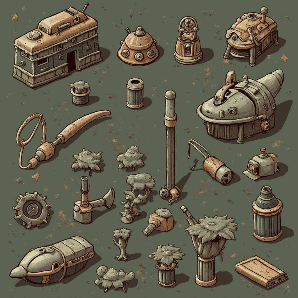 An assortment of unique, vintage-looking objects in muted greens, browns, and beige, arranged on a textured green background.