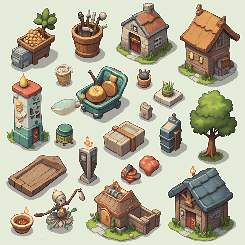 An assortment of whimsical buildings and objects, including a tree, house, cart, barrel, bucket, pot, toolbox, stove, fire, and fruit, populates a charming scene.