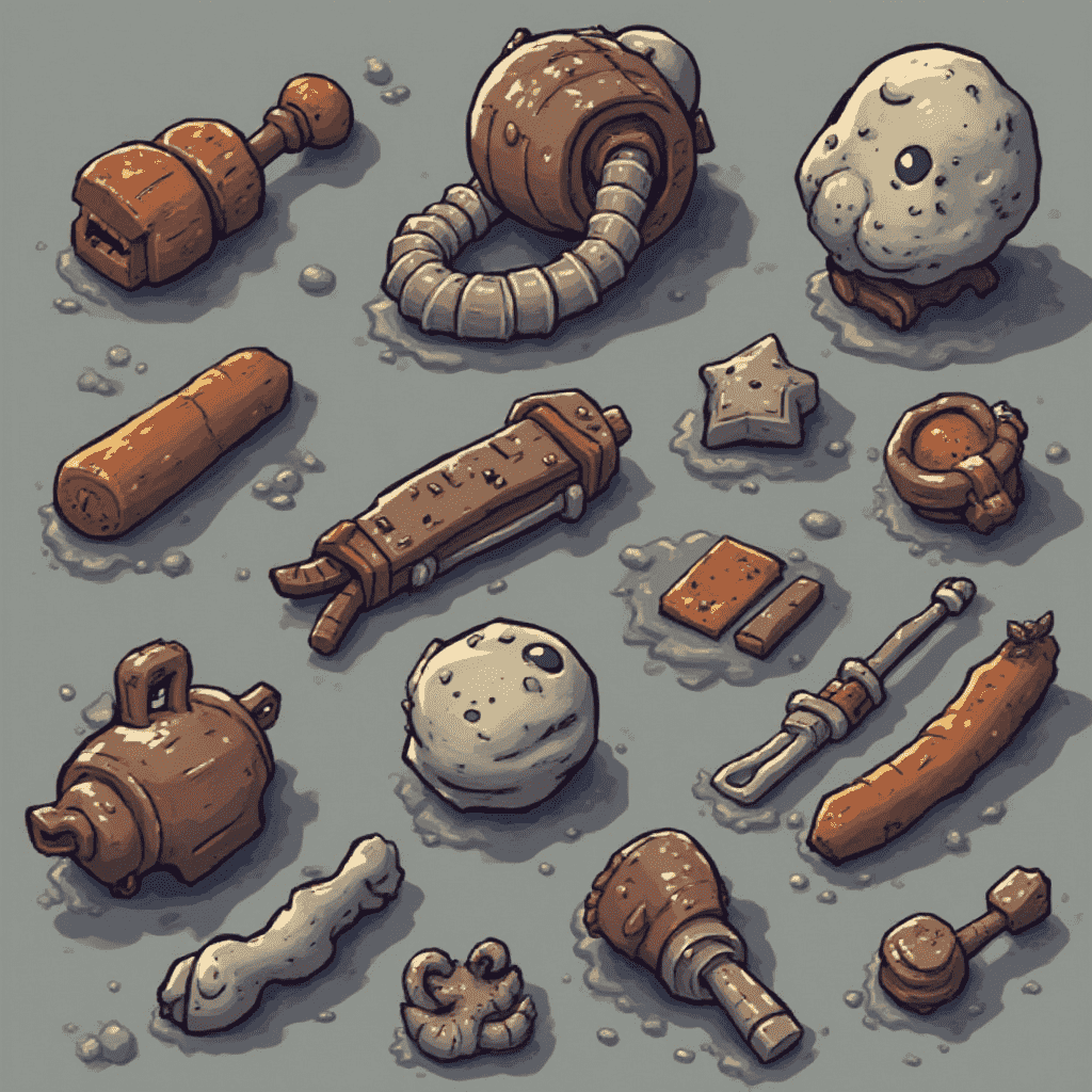 An assortment of whimsical, organic-looking objects in brown, orange, and white, scattered across a gray surface.