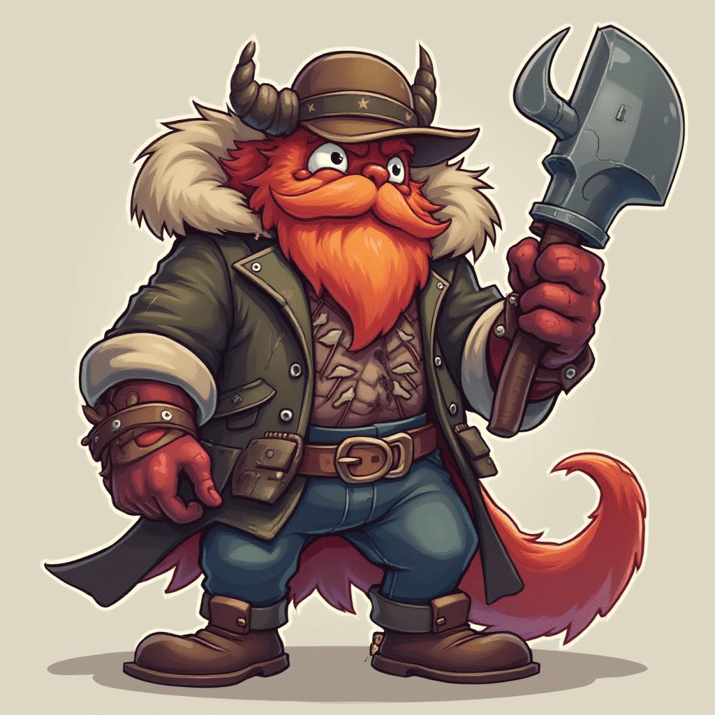 A bearded, horned humanoid character in a green coat, brown hat, and red gloves holds a large axe and wears a belt with pouches.