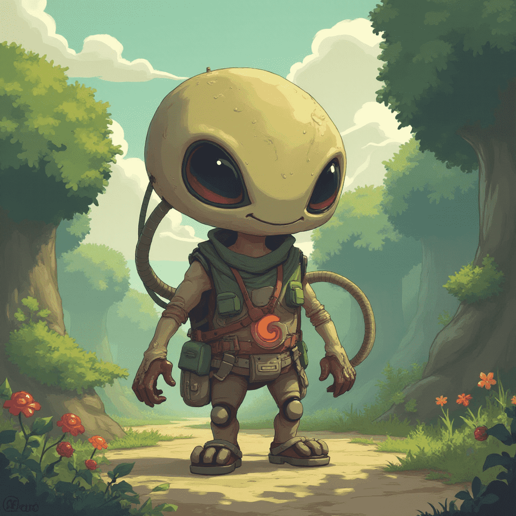 A beige alien with red eyes, green scarf, and utility gear stands on a dirt path in a lush forest, surrounded by red and orange flowers.