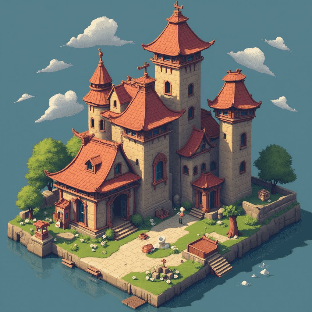 A charming, castle-like structure with red roofs and orange walls sits on a small island, surrounded by blue water and white clouds.