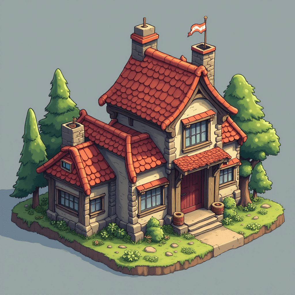 A charming, two-story cottage with a red tiled roof, flag, and chimney sits on a small island amidst trees.