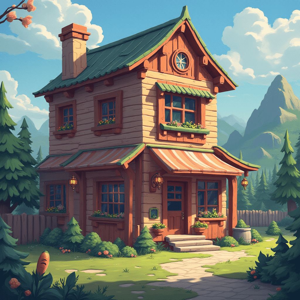 A charming two-story house with a red roof, green awning, and red door is nestled in a lush forest with pink flowers and a distant mountain.
