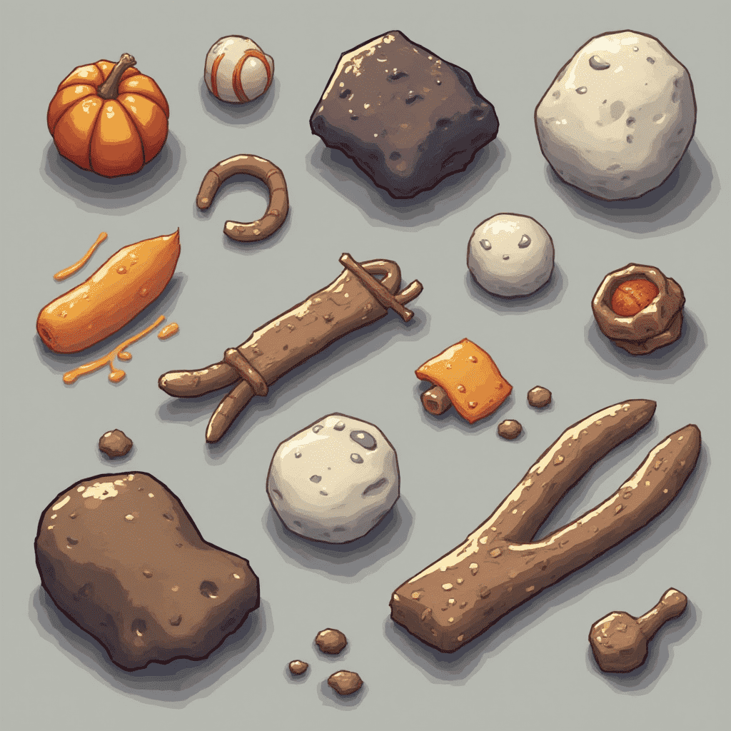 A collection of objects, including a pumpkin, baseball, rock, hockey puck, bread, potato, ball, rock, wooden stick, and small bowl, are scattered on a gray surface.
