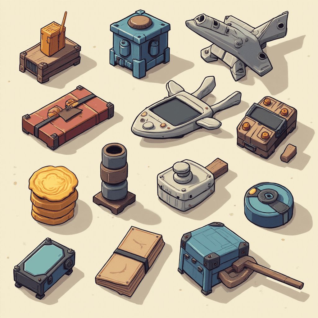 A collection of unique, colorful objects including a blue box, gray spaceship, brown chest, blue toolbox, and wooden stack, arranged on a beige background.