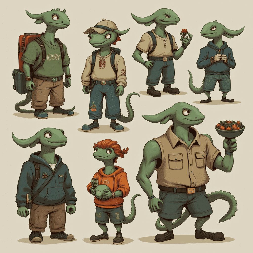 Eight cartoon reptiles in various outfits and poses, displaying diverse expressions and actions.