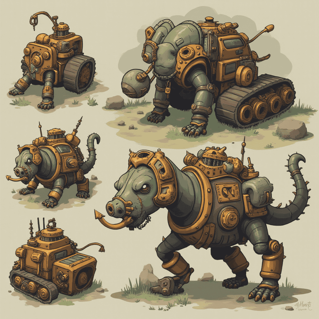 Five stylized robot creatures in various poses, primarily in orange and brown hues, display mechanical forms, spikes, and weapons.