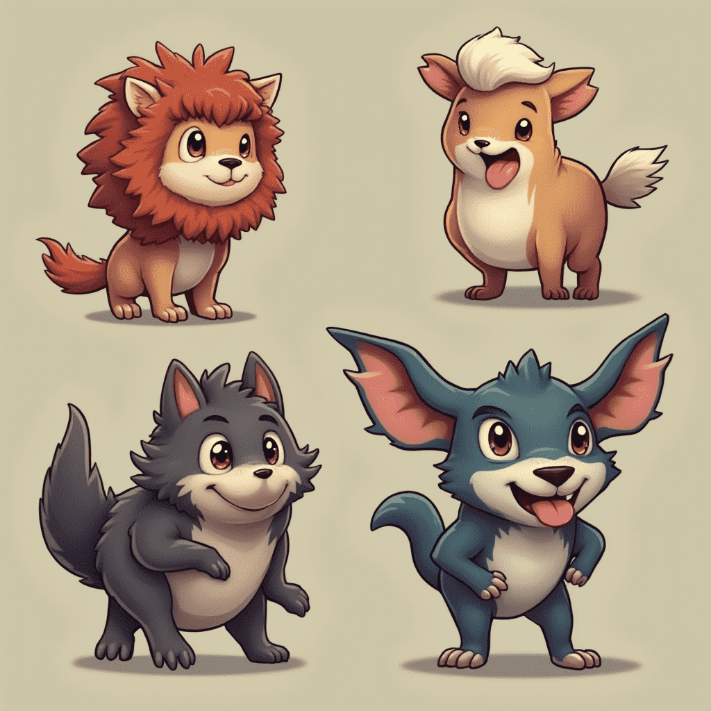 Four cartoon animals - a lion, a dog, a wolf, and a cat - interact in a playful scene.