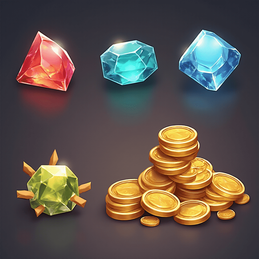 Four gems, three crystals and one gold coin, are arranged against a dark gray backdrop.