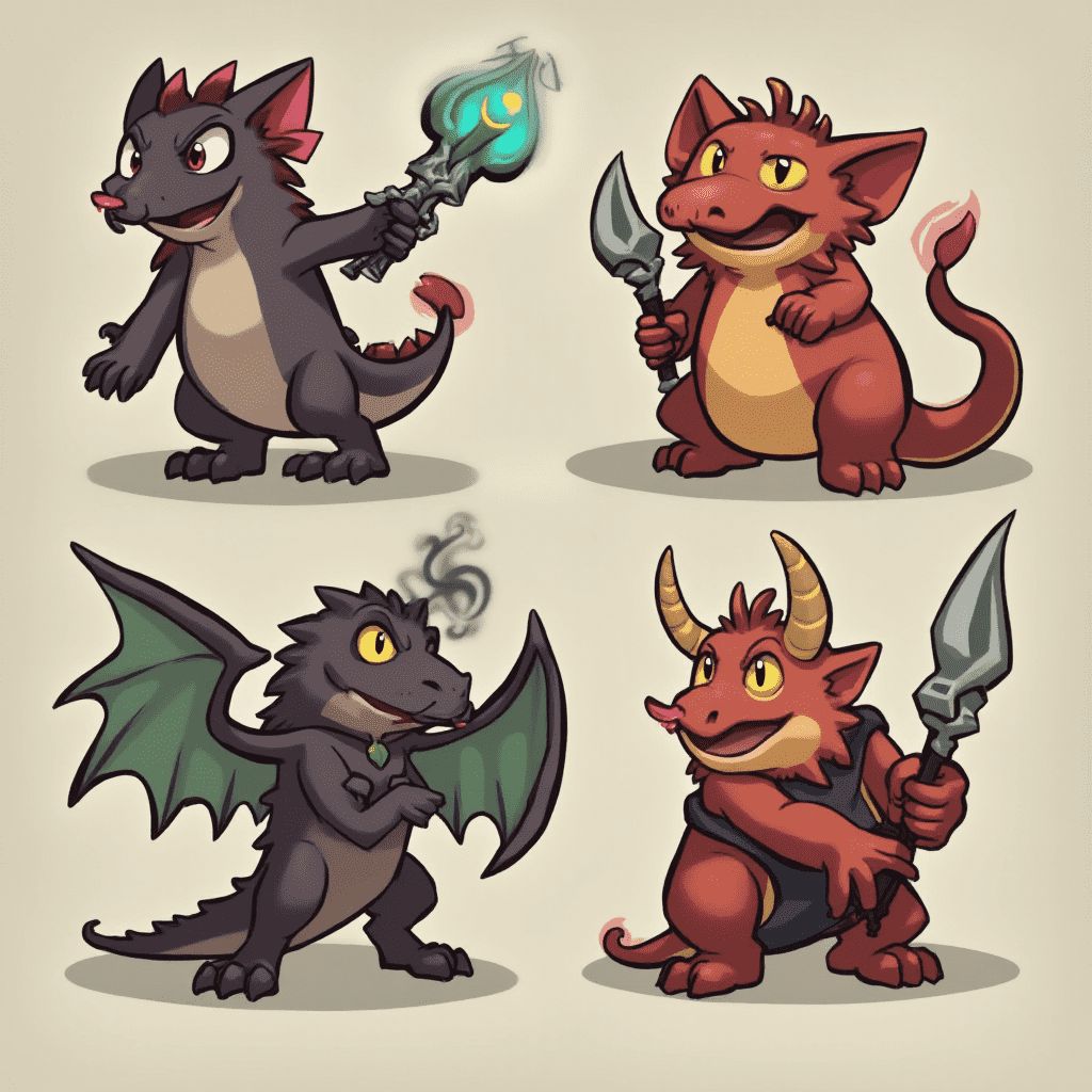 Four stylized creatures, each with unique features and weapons, stand against a light beige backdrop.