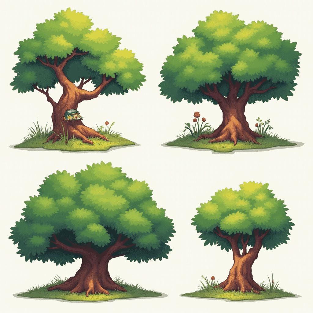 Four stylized trees with green canopies and brown trunks are arranged in a square, each with small red flowers and patches of grass.