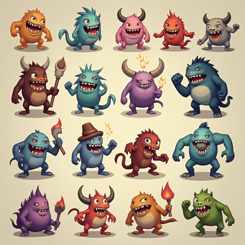 A grid of 12 cartoon monsters in various colors and poses, displaying diverse expressions and weapons.
