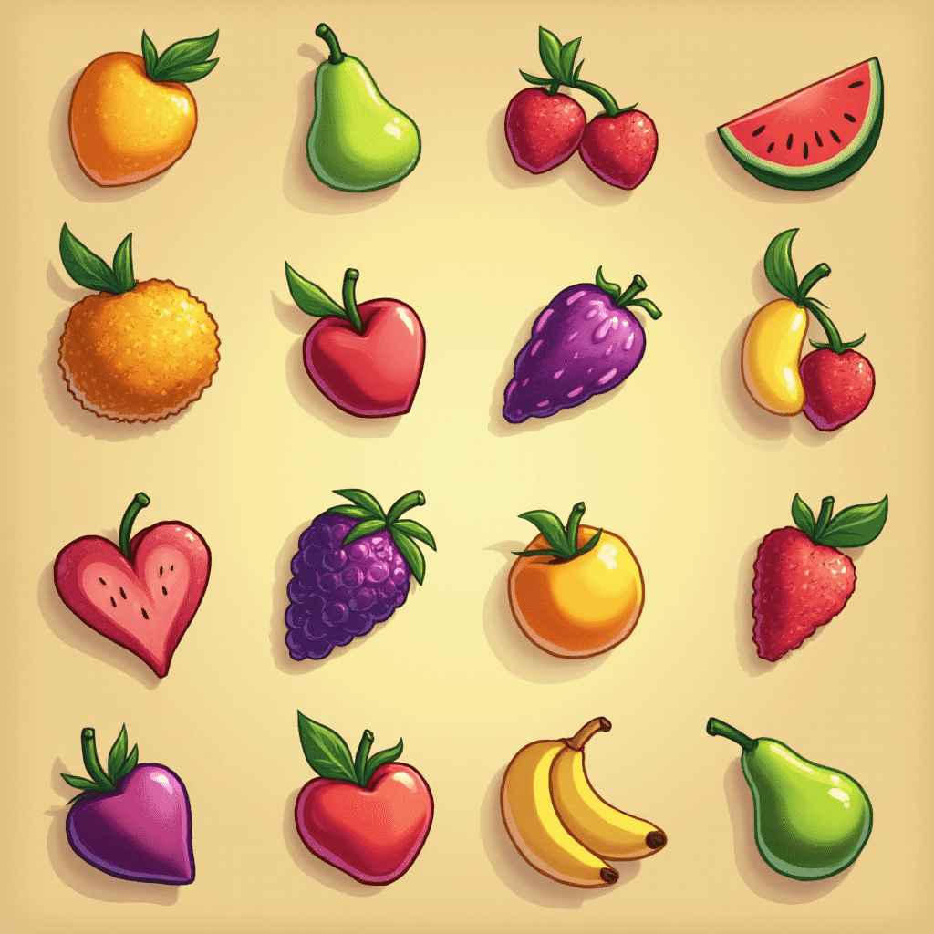 A grid of 12 colorful fruits, including oranges, pears, cherries, watermelon, apples, grapes, strawberries, bananas, and pears, is arranged against a light yellow backdrop.