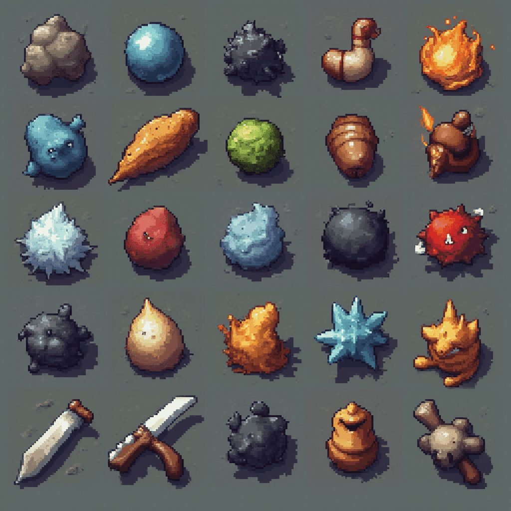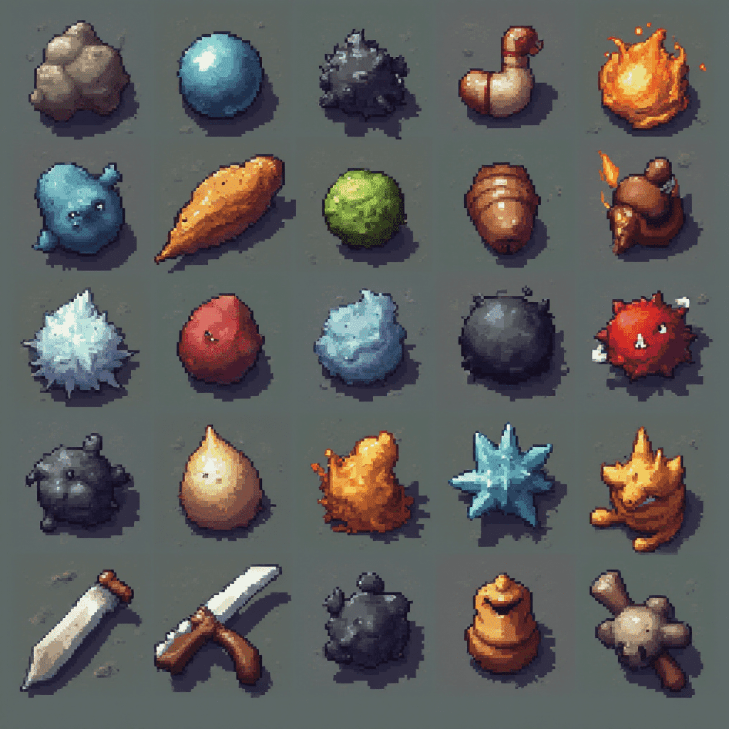 A grid of 25 pixel art creatures, each unique in color and form, stands ready for interaction against a simple gray background.
