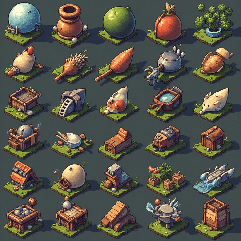 A grid of 25 unique isometric illustrations features objects and structures in various colors and textures, set against earthy tones.