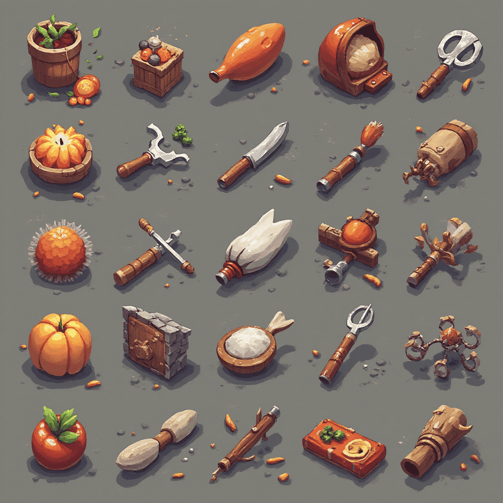 A grid of 25 unique objects, ranging from tools to fruits and containers, features warm colors and whimsical designs.