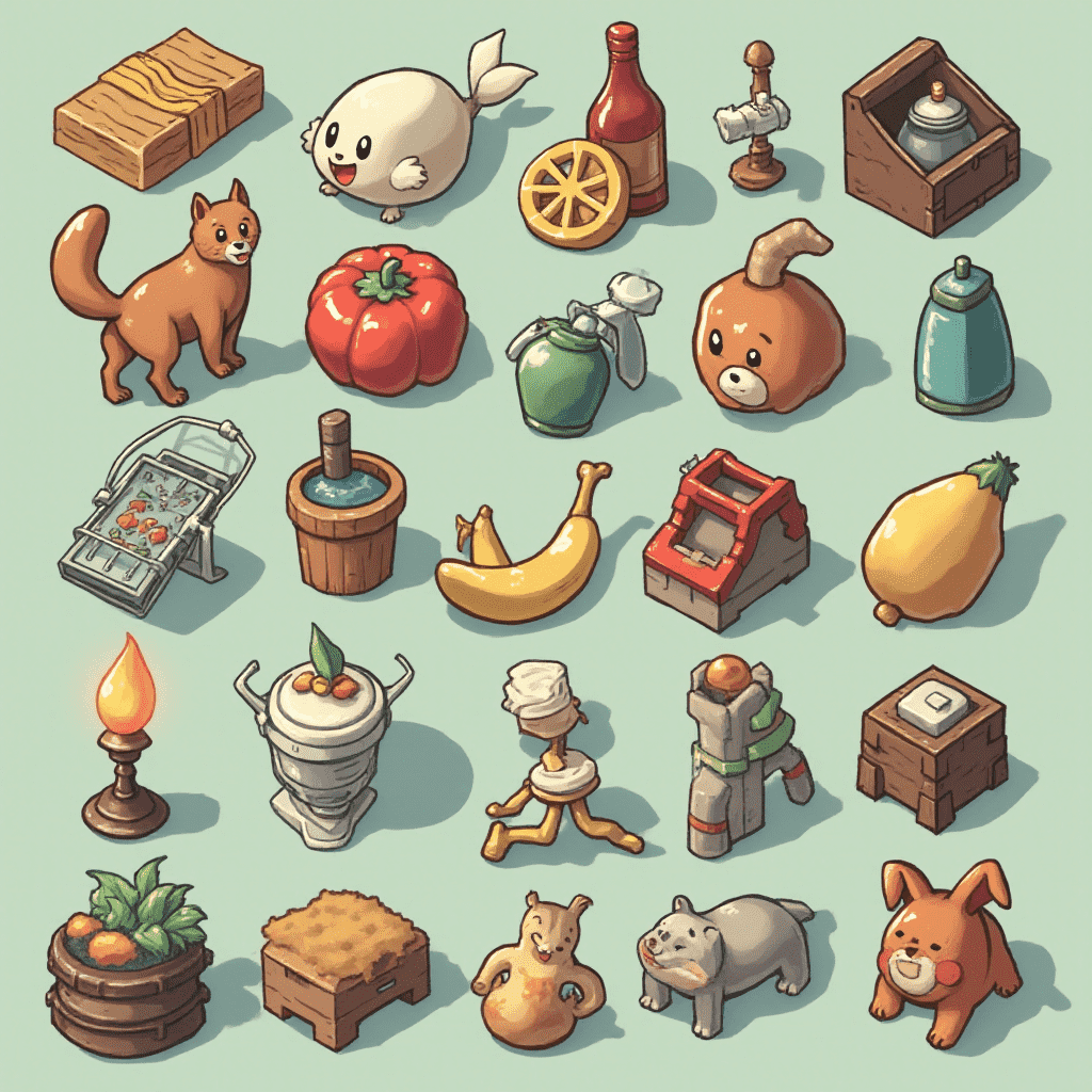A grid of 25 whimsical, cartoon-style objects features a cat, fish, plump tomato, bottle, lamp, cake, banana, chest, candle, pot, figurine, hippopotamus, and dog.