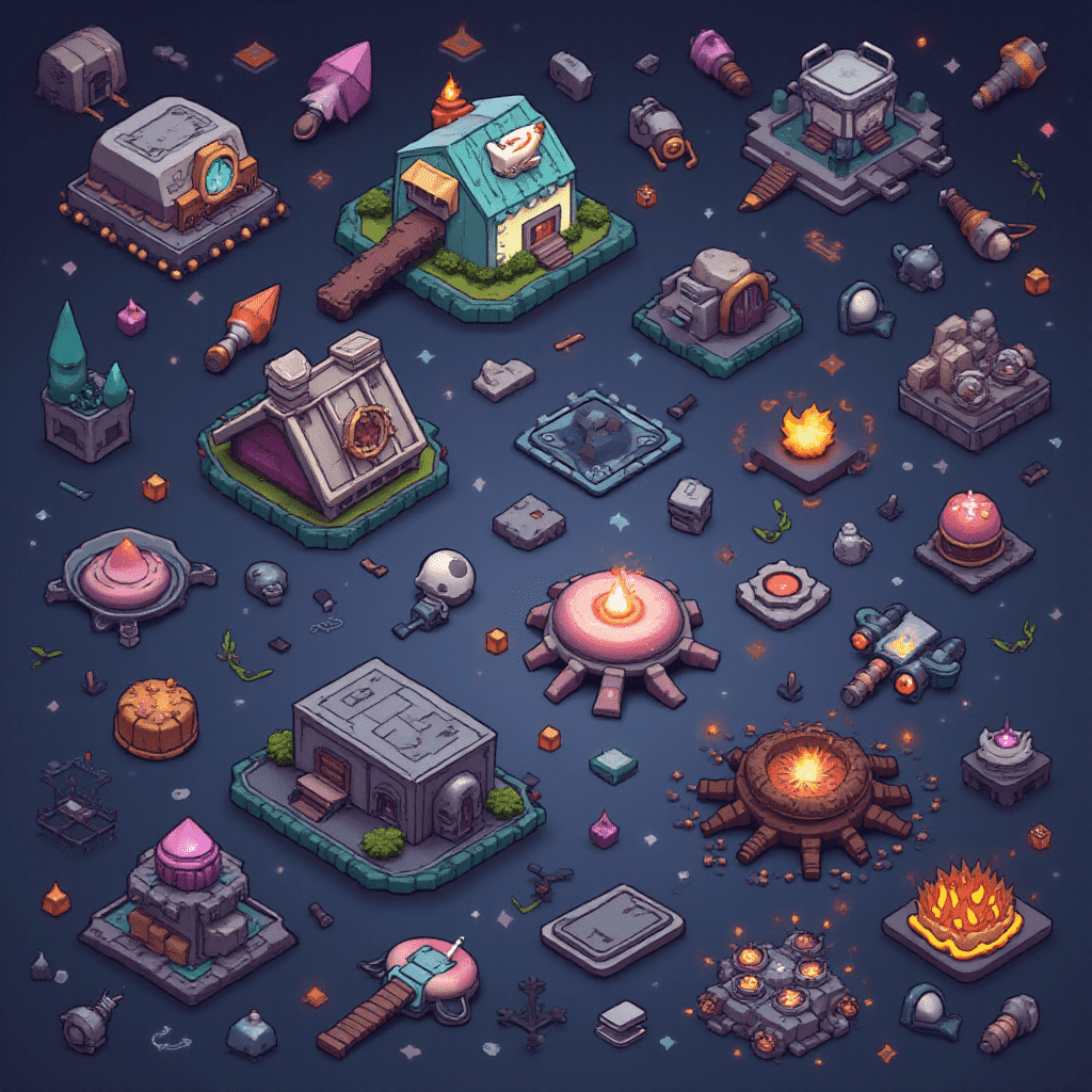 A grid of colorful, unique buildings with diverse features and symbols is set against a dark blue background.