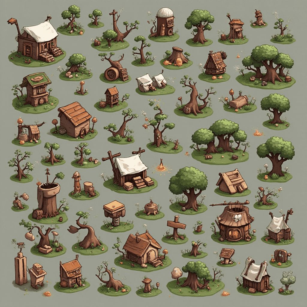 A grid of colorful, whimsical houses and trees with unique features, set against a light green backdrop.