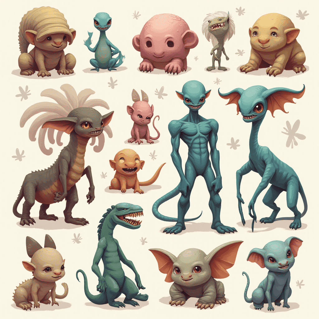 A grid of fantastical creatures, varying in color and form, poses with unique expressions against a light beige background.