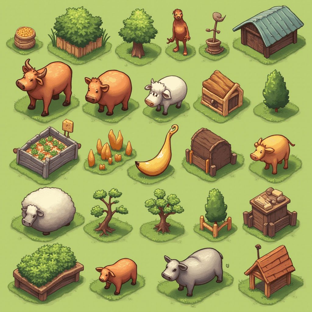 A grid of farm animals and structures, including cows, sheep, trees, houses, and a banana, coexists harmoniously in a lush green setting.