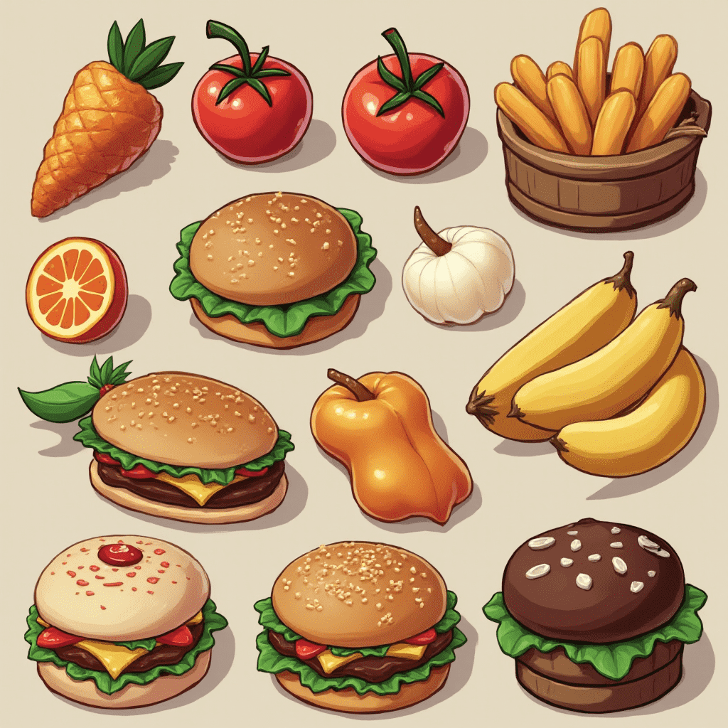 A grid of illustrated food items includes carrots, tomatoes, potatoes, oranges, burgers, bananas, peppers, and hamburgers.