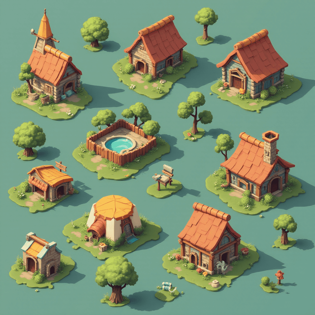 A grid of nine colorful, low-poly houses with red roofs and trees on a blue-green background.