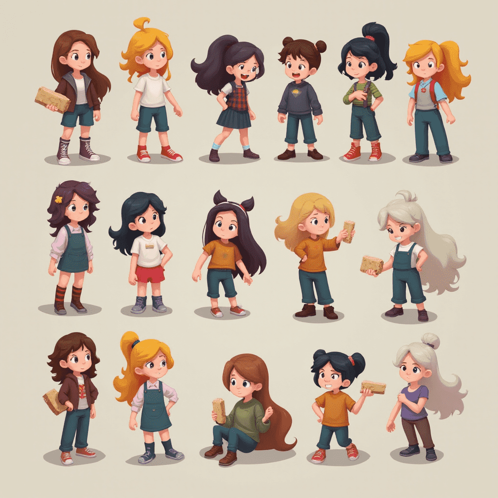 A grid of sixteen cartoon girls in various outfits, hairstyles, and poses, arranged in four rows and three columns.