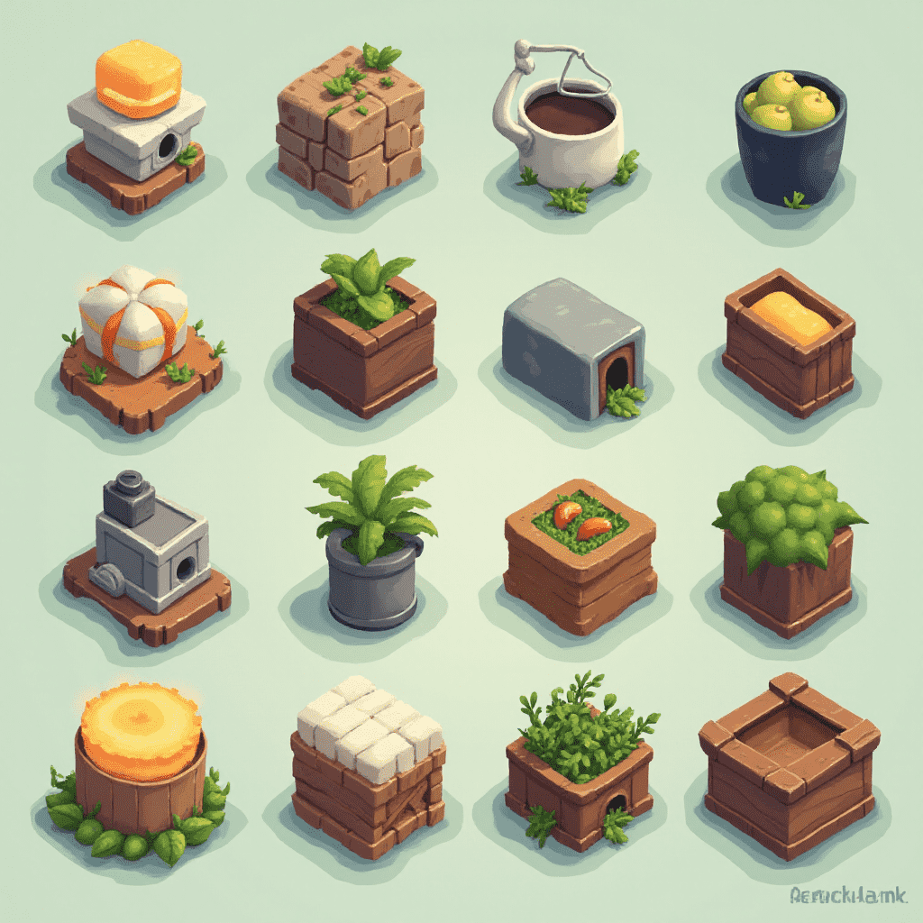 A grid of sixteen isometric illustrations showcases various objects and plants in diverse containers and settings.