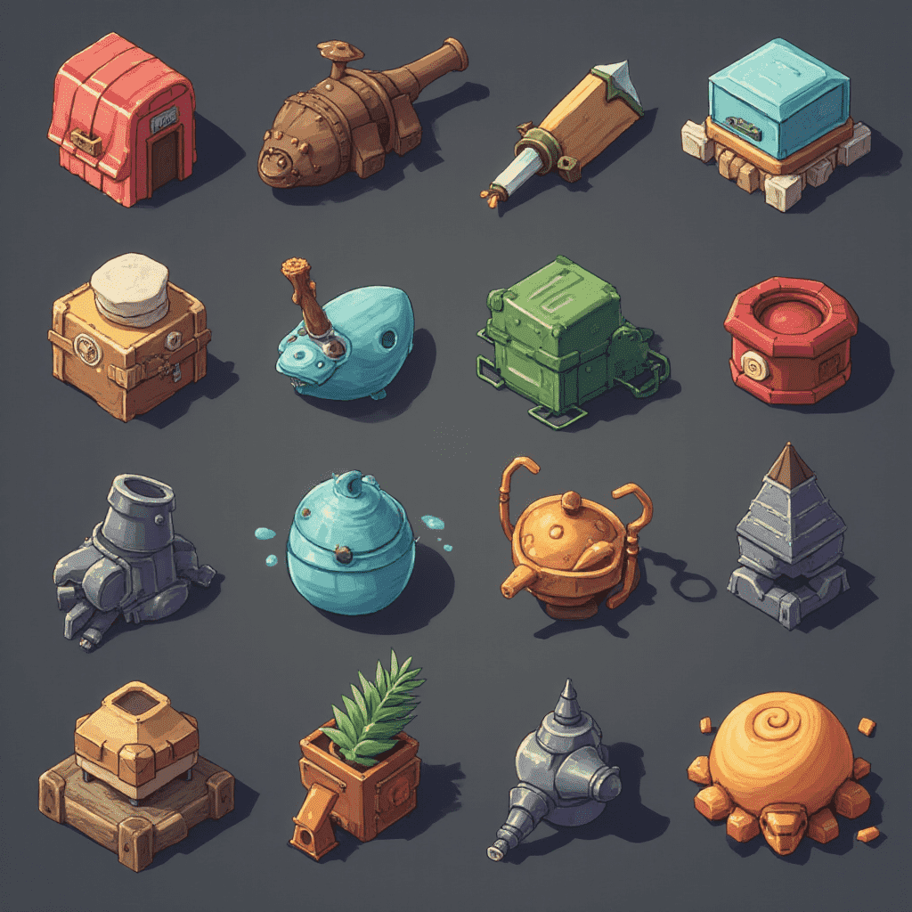 A grid of sixteen unique, colorful, and detailed isometric objects, including a red building, brown cannon, green robot, blue sphere, yellow pyramid, orange sphere, and blue pot, arranged against a dark gray background.