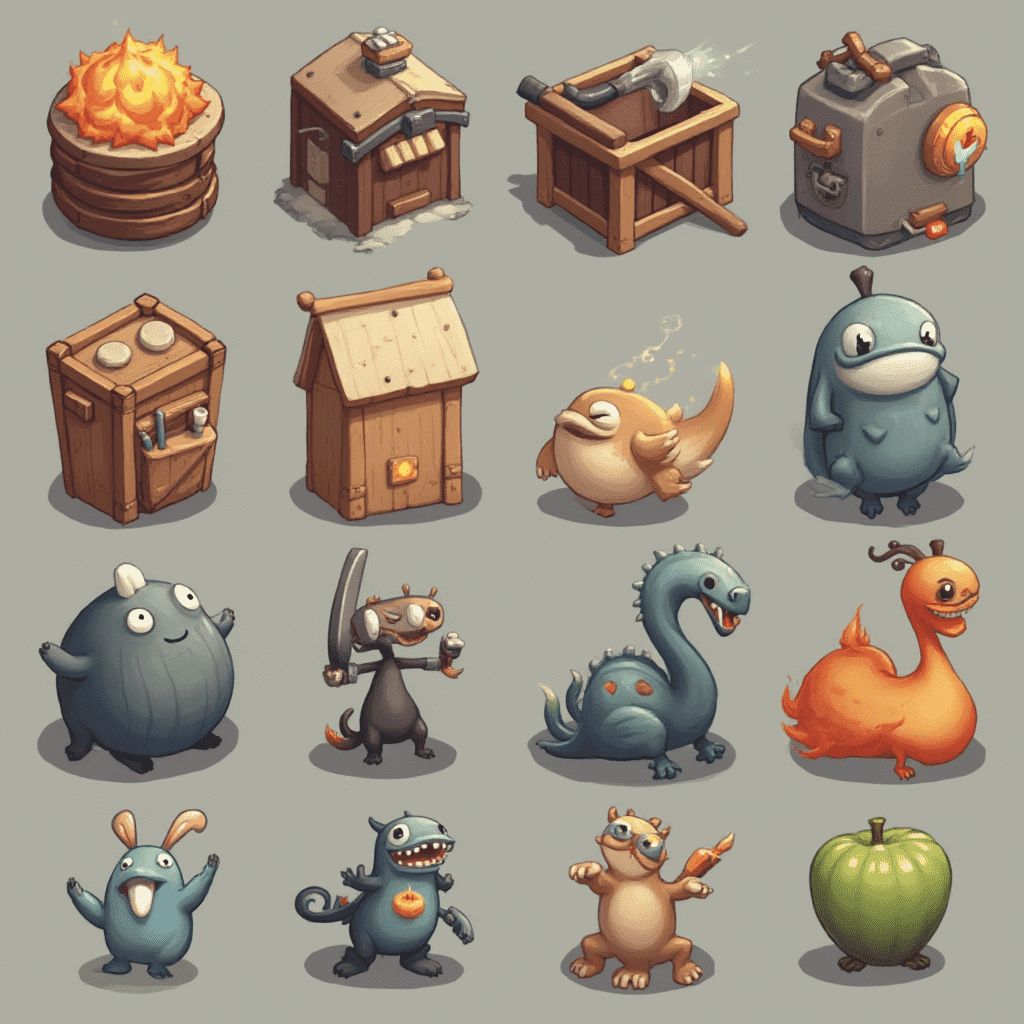 A grid of sixteen whimsical, cartoon-style creatures and objects, including a wooden house, fire, tools, and fruits, adds a sense of depth and diversity.