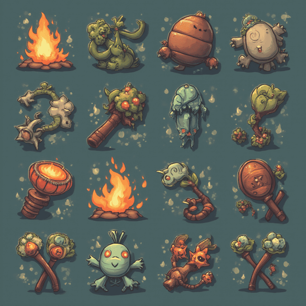 A grid of sixteen whimsical, cartoon-style creatures with unique features and objects, set against a dark green background with scattered orange and yellow spots.
