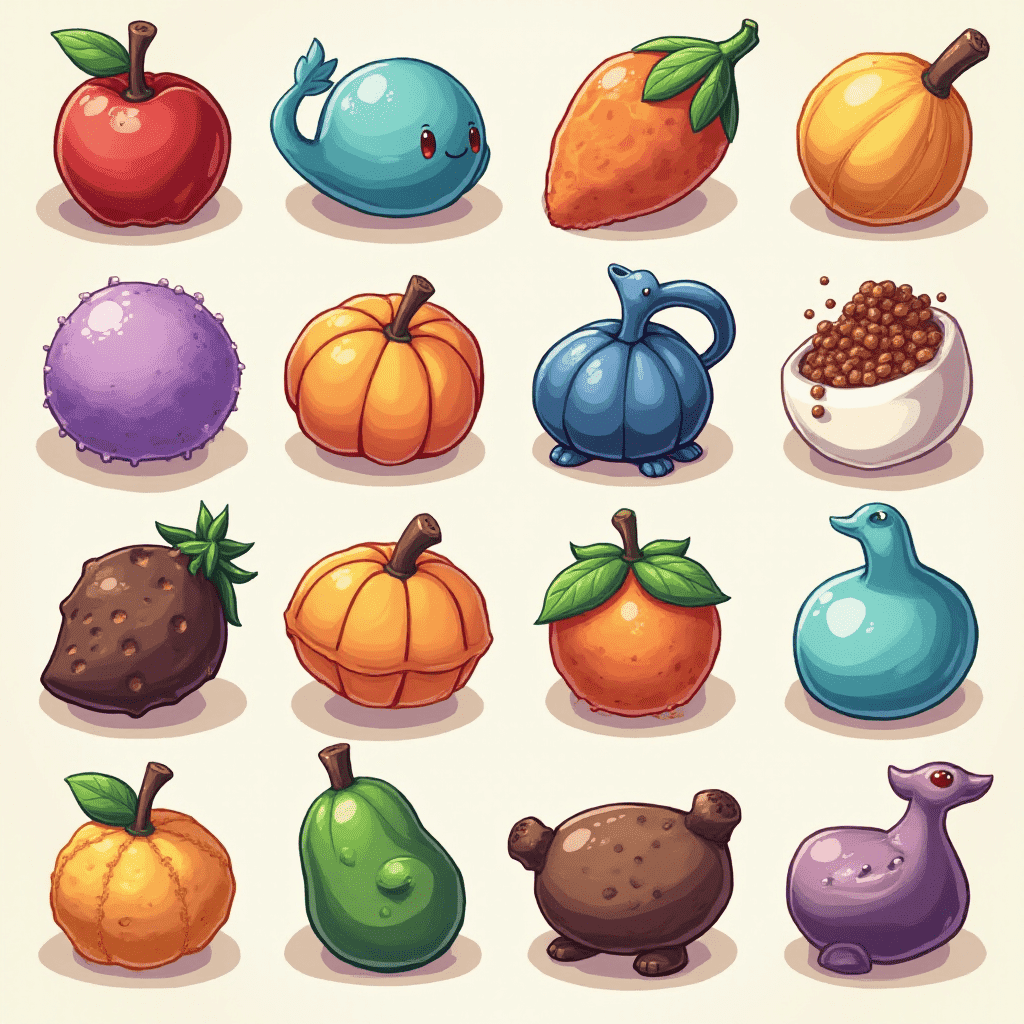 A grid of sixteen whimsical, cartoon-style fruits and animals, including apples, whales, oranges, pumpkins, strawberries, pumpkins, oranges, teddy bears, dolphins, and seahorses.